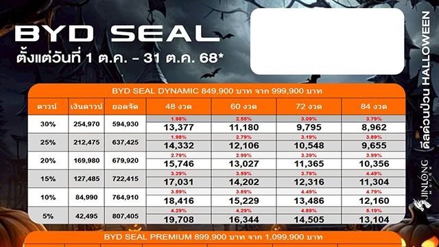 ราคาและตารางผ่อน BYD SEAL ตั้งแต่วันที่ 1 - 31 ตค. 68 บีวายดี จินหลง สาขารังสิต