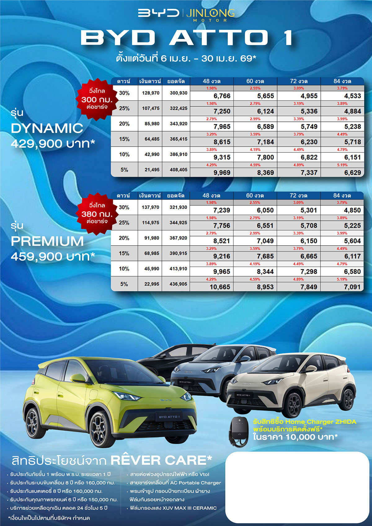 ราคาและตารางผ่อน BYD ATTO 1 ตั้งแต่วันที่ 6 เม.ย. 69 – 30 เม.ย. 69*