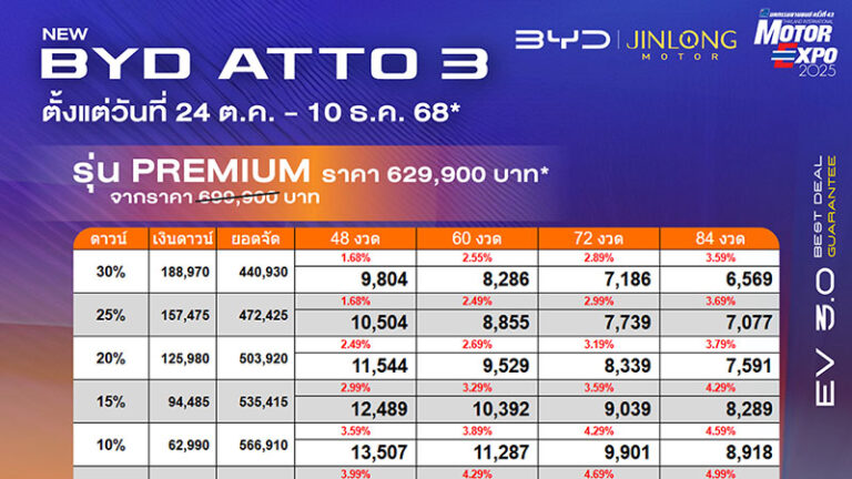 ราคาและตารางผ่อน BYD ATTO 3 ตั้งแต่วันที่ 24 ตค. - 10 ธค. 68