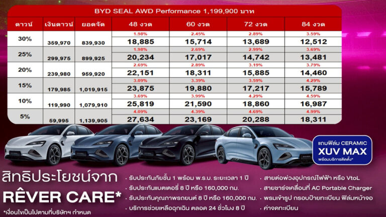 ราคาและตารางผ่อน BYD SEAL ตั้งแต่วันที่ 1 สค. - 31 สค. 68 บีวายดี จินหลง สาขารังสิต