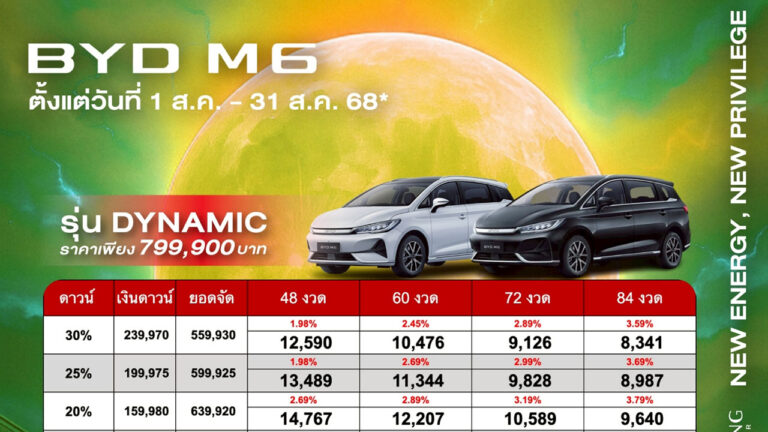 ราคาและตารางผ่อน BYD M6 ตั้งแต่วันที่ 1 สค. - 31 สค. 68 บีวายดี จินหลง สาขารังสิต