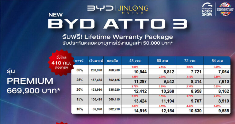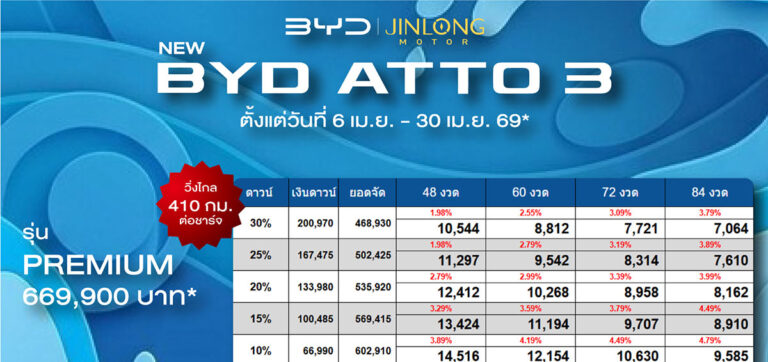 ราคาและตารางผ่อน BYD ATTO 3 ตั้งแต่วันที่ 23 มี.ค. 69 - 5 เม.ย. 69