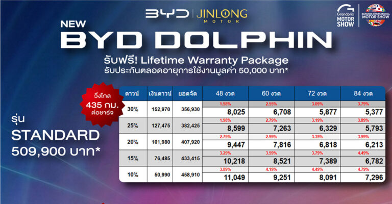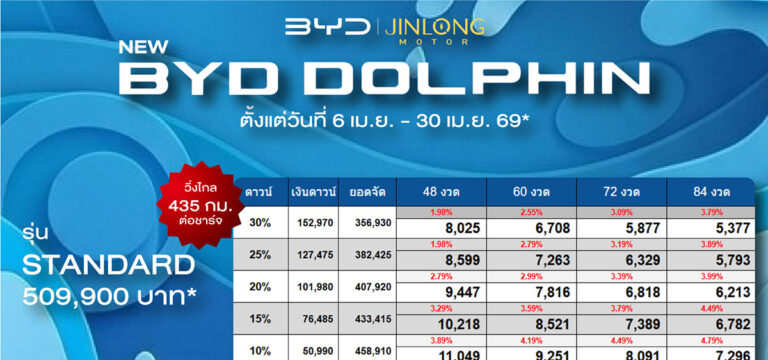 ราคาและตารางผ่อน BYD DOLPHIN ตั้งแต่วันที่ 23 มี.ค. 69 - 5 เม.ย.69*