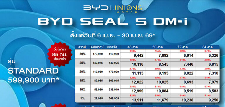 ราคาและตารางผ่อน BYD SEAL 5 DM-i ตั้งแต่วันที่ 6 เม.ย. 69 - 30 เม.ย. 69*