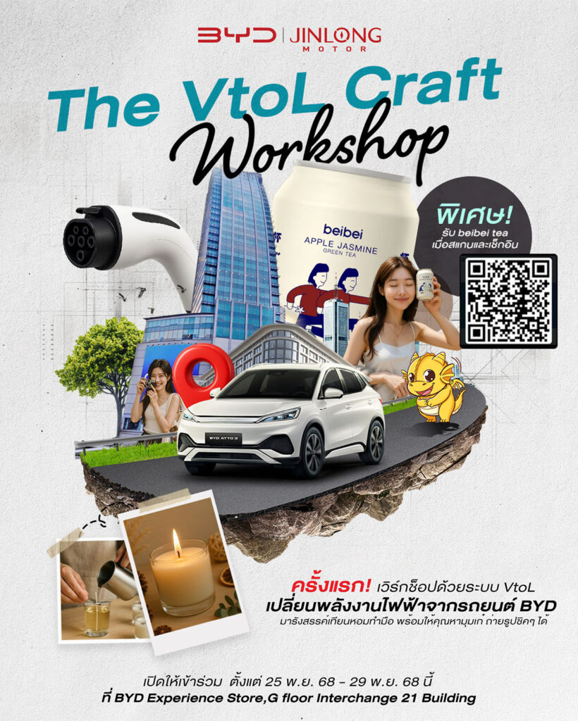 BYD จินหลงมอเตอร์เชิญคุณสัมผัสเวิร์กช็อปสุดพิเศษ ทดลองใช้เทคโนโลยี VtoL เปลี่ยนพลังงานไฟฟ้าจากรถ BYD ใช้ในชีวิตประจำวัน 🔌🕯️